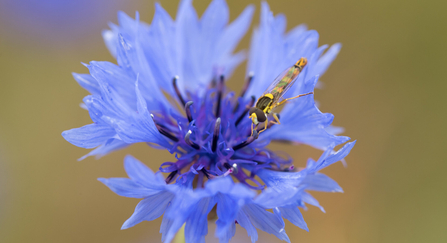 Long hoverfly (Sphaerophoria scripta) on cornflower at Bonhurst Farm, Surrey Wildlife Trust