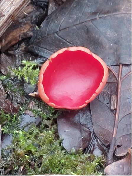 Here are photos of one colourful fungi I have seen many times at Newdigate in various locations around the Reserve (Pictures 1 and 2). It is most likely the Scarlet Elf Cup, Sarcoscypha austriaca, which is common and widespread, but it might just be the Ruby Elf Cup, Sarcoscypha coccinea, which is also widespread but scarce. They are identical to the naked eye and only separable under the microscope.