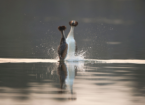 The graceful great crested grebe is a familiar sight on our lakes and reservoirs, and is well-known for its elaborate courtship dance, during which it rises vertically out of the water and shakes its head. Also look out for humbug-striped chicks riding on their mothers back.