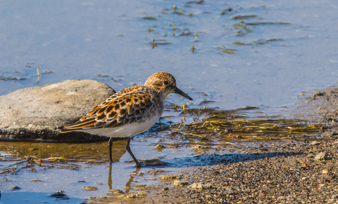 The smallest wader regularly encountered in the UK, generally about two-thirds the length of a dunlin - though dunlin can be very variable! When seen with other waders, the small size usually stands out. It has a medium-length black beak that narrows to a fine tip. The legs are medium length and dark.In summer, adults are very bright little birds. They have a white belly and throat, with an orange wash to the face and breast sides. The back feathers have black centres with bright, reddish-brown fringes. In winter, they become much duller, with grey back feathers and a greyish wash to the face and breast sides.