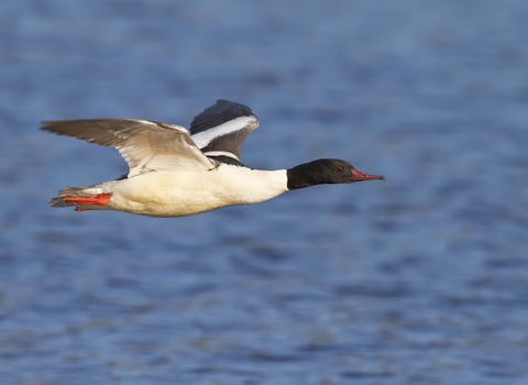 The streamlined goosander is a handsome bird and a great fisher - its long, serrated bill helps it to catch and hold its slippery fish prey. It nests in riverbank trees, but can be seen on lakes and reservoirs in winter.