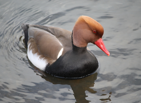 A drake red-crested pochard swimming. It's a striking duck with a black breast, brown back and head, fiery orange crown and bright coral red beak.