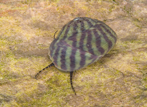 These small, highly attractive sea snails are very common across most seashores and shallow waters, spending most of their time grazing on seaweed and rocks. Occasionally, you can see their two striped antennae sticking out when they are on the move.