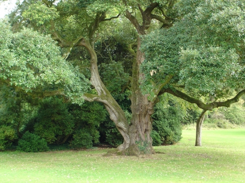 The Holm oak is an introduced species that has been widely planted near the coast and in parkland. It is self-seeding in the south of the UK. Its young leaves are spiny like Holly leaves, and it produces acorns.